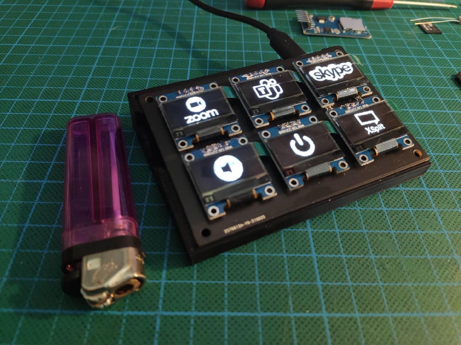 In diesem Projekt hingegen werden kleine OLEDisplays mit einem darunter liegenden Taster eingesetzt - zusammen mit zwei Multiplexer IC, die die i2c Datenleitung für 6 Displays umschalten und einem Arduino Pro Micro (Leonardo) der per USB als HID (Human Interface Device) als Tastatur an den PC angeschlossen wird. Es kann hinter jedem Display eine Tastaturfolge oder ein Sprung in ein Untermenü hinterlegt werden.