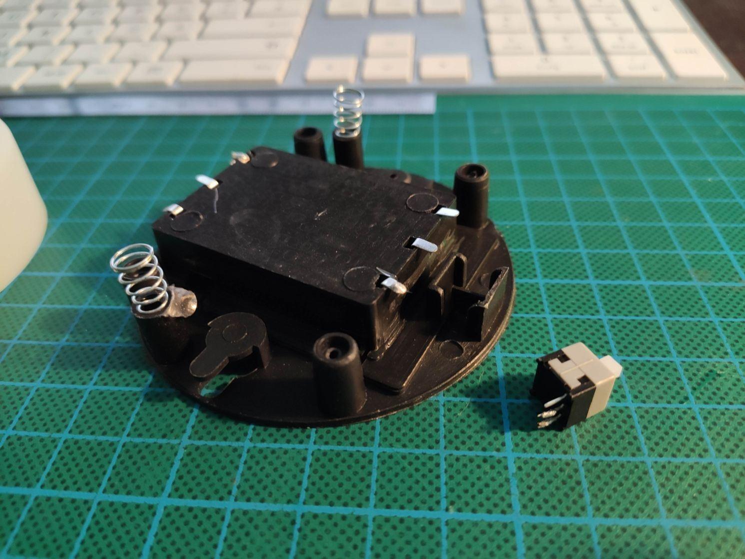 Als Basis habe ich dazu eine billige Batterielampe benutzt, die man mittels drücken auf die Kuppel ein-/ausschalten kann. Es ist dort ein kleiner Druckschalter mit nur einer weißen LED und einen in Reihe geschalteten Widerstand zu den 3 Batterien verbaut.