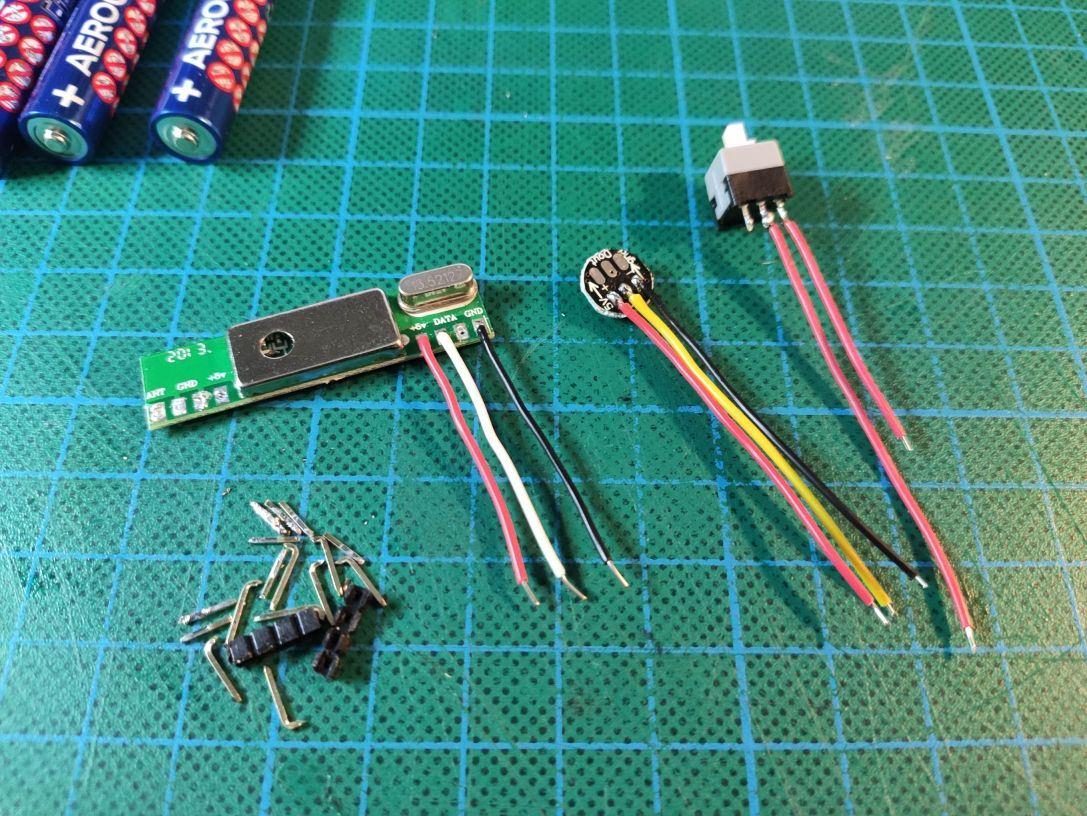 Am Funkempfänger entfernt man zuerst die gelöteten Pins, lötet dann 3 kleine Kabel für 5V/GND/Data