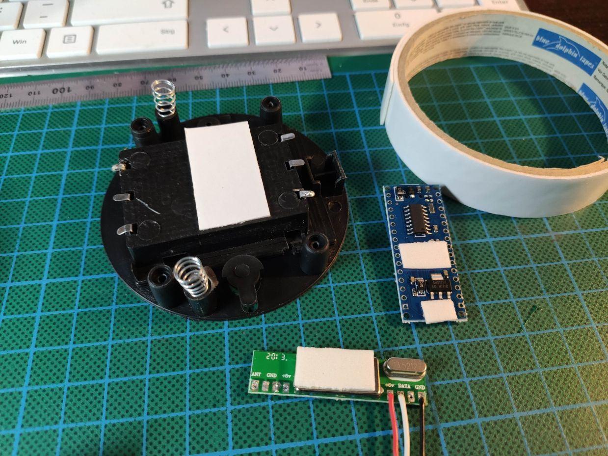 Der Funkempfänger und Arduino Nano können nun mit doppelseitigem Klebeband auf dem inneren Gehäuse fixiert werden