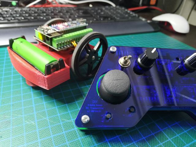 Für die "Gegenseite" habe ich mir ein kleines Fahrzeug konstruiert, ebenfalls auf Basis eines Arduino & NRF2401, einem 18650 Li-ion Akku und zwei 360° rotierende Modellbauservomotoren.