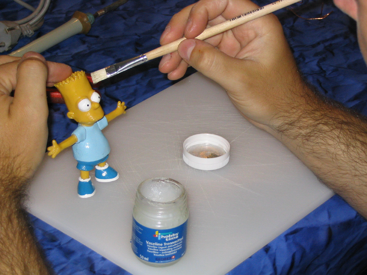 Zuerst wird die abzuformende Figur mit einem Trennmittel eingestrichen, damit sie später von der ausgehärteten Form herausgelöst werden kann. Dazu wird sie mt Vaseline und einem Pinsel komplett eingestrichen.