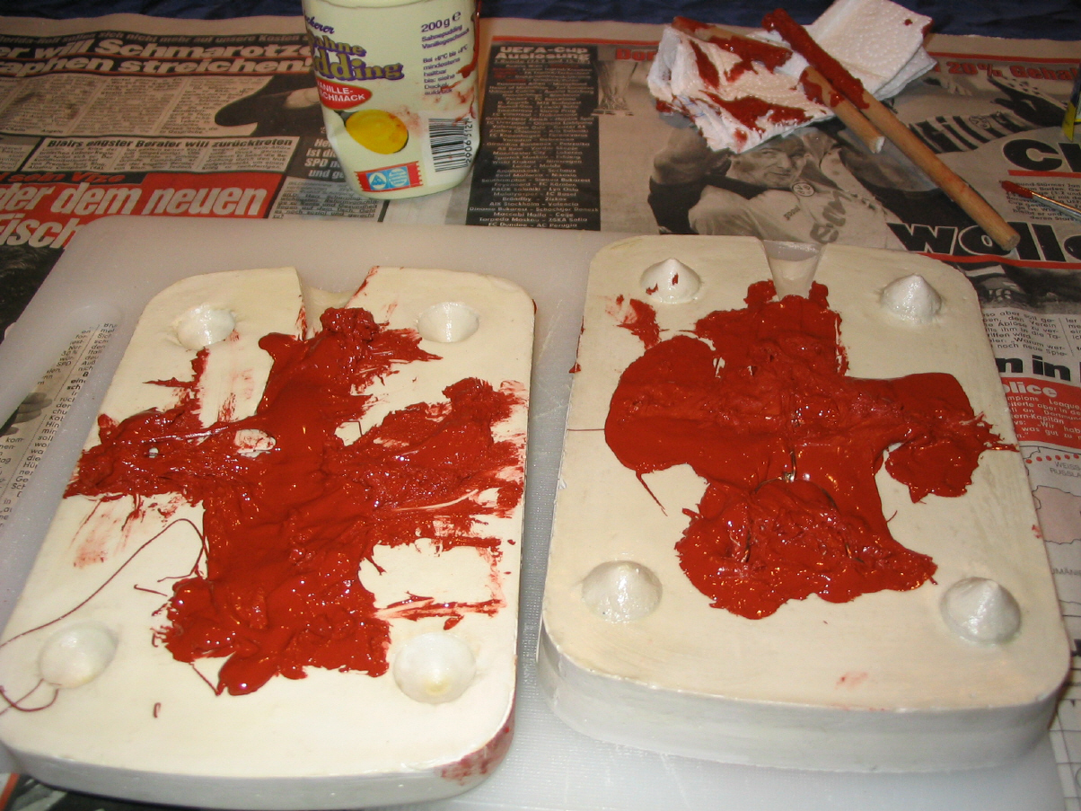 Die andere Gusshälfte und die Stellen, wo die Figur war, werden nun wieder zuerst mit Klarlackversiegelt und dann mit Vaseline bestrichen. Damit hat man nun den genauen Negativabdruck, von dem man nun unendlich viele Figuren erzeugen kann.
