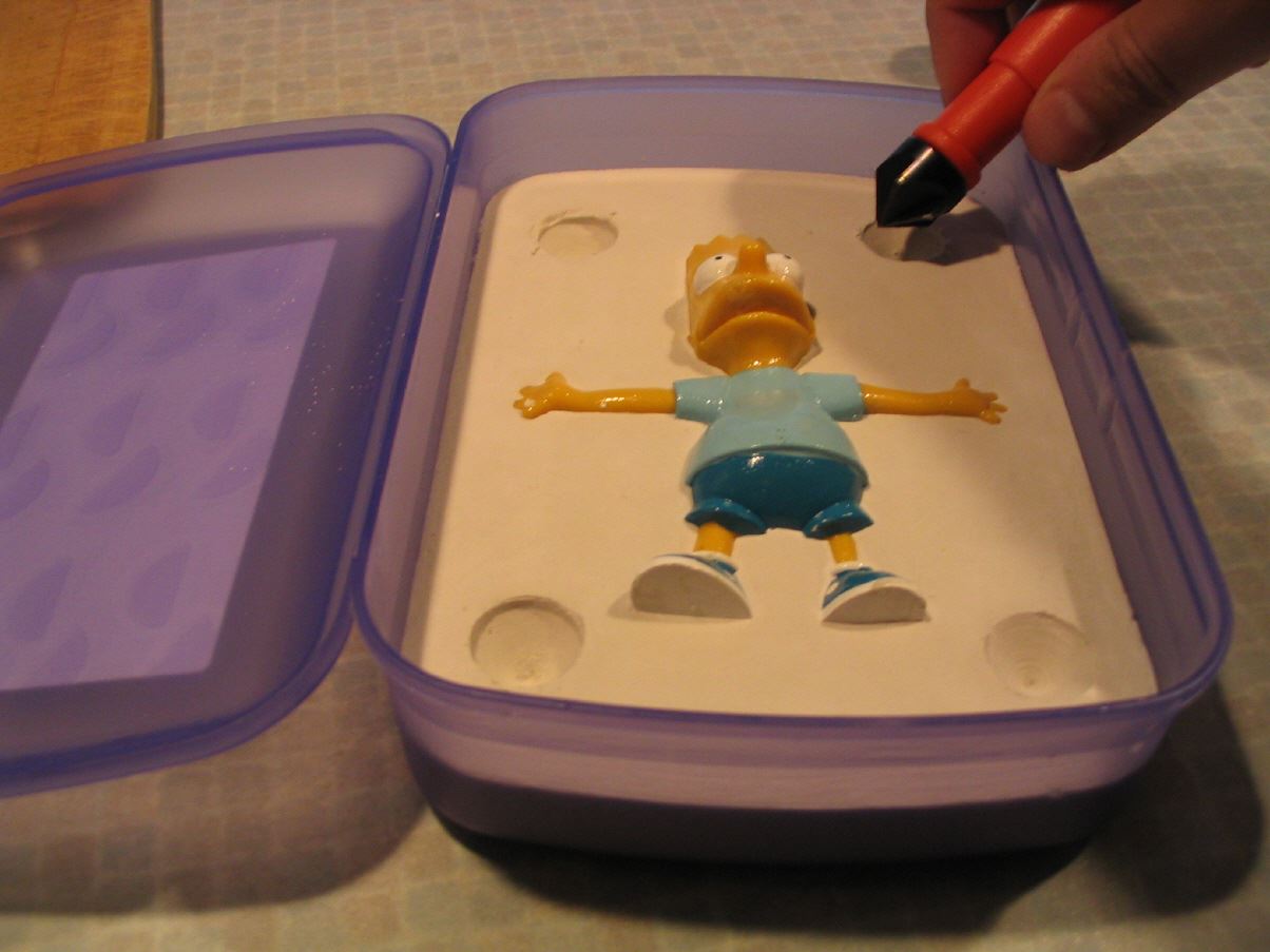 Als Behälter für die Form habe ich eine billige Brotdose aus Kunststoff genommen. Es muss darauf geachtet werden, dass die Höhe des Behälters etwas höher als der Durchmesser der Figur ist, damit sie von allen Seiten gut mit der Masse umschlossen ist.