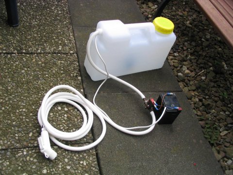 Man nimmt einfach einen Wasserbehälter, setzt dort eine Tauchpumpe rein, schliesst in die Zuleitung zum Brausekopf eine Druckschalter ein, der die Pumpe ausschaltet, sobald die Dusche unter erhöhtem Druck steht (Brausekopf ist dicht). Alles in einem eine Sache von ein paar Minuten, am Weekend will ich noch den Druckschalter vernünftig an den Wasserbehälter anbringen und eine Zuleitung mit 12V KFZ-Stecker anschrauben.