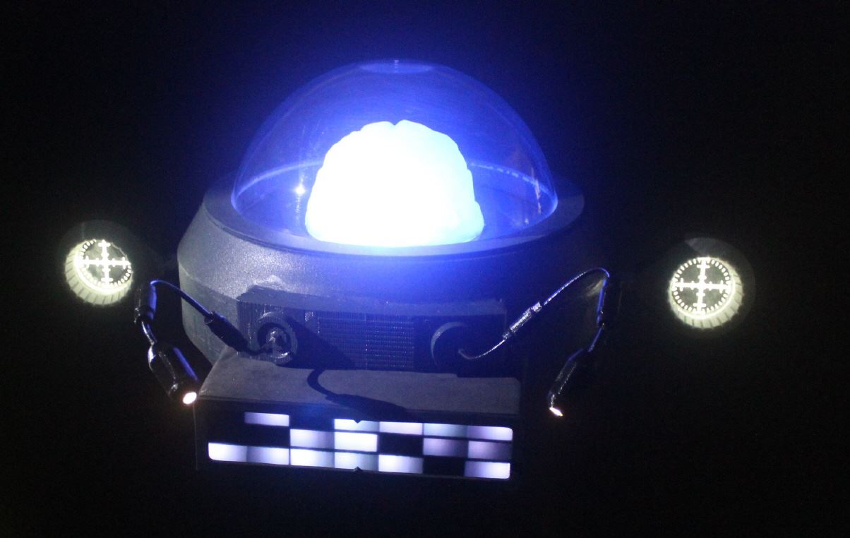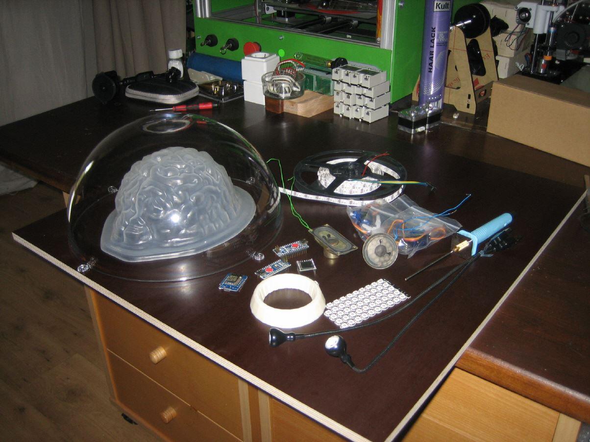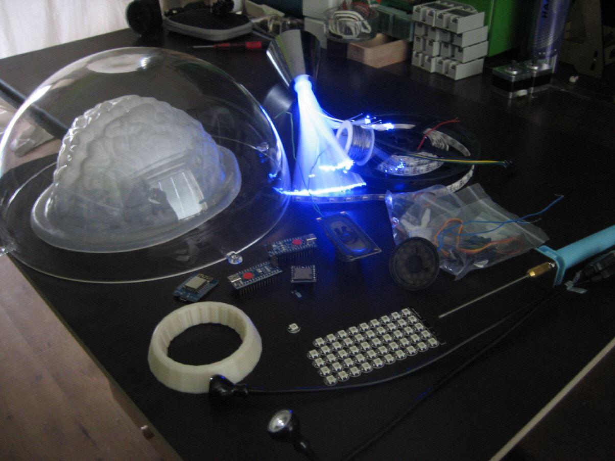 Für die Makerfaire 2017 in Hannover wollte ich dieses unbedingt ein langgehegten Wunsch umsetzen - den "Professor Wright", dem fliegenden Gehirn aus der Zeichentrickserie "Captain Future" als Exponat zu bauen. In etwa Originalgröße, mit diversen Blink- und Soundeffekten...es wurde hauptsächlich aus Hausisoliermaterial, einer Puddingform (Gehirn), diversen gedruckten und gefrästen Teilen und 4 Arduinos, die die Lichter, die Soundmodule und Gondelservos steuern gebaut.