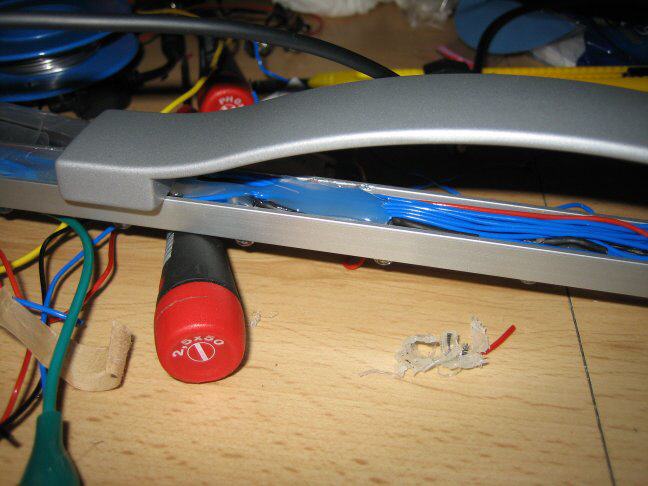 Den Startknopf habe ich ebenfalls per Kabel angeschlossen, damit kann man nämlich evtl. mal einen Helfer oder so auslösen lassen, ausserdem sollten jegliche "Wackelmöglichkeiten" durch Knopfdrücken an der Mechanik vermieden werden. Als "Auslöser" habe ich einfach einen kleinen Taster in ein Alurohr (mit Heißkleber) vergossen, welches nun perfekt in der (anderen) Hand liegt.