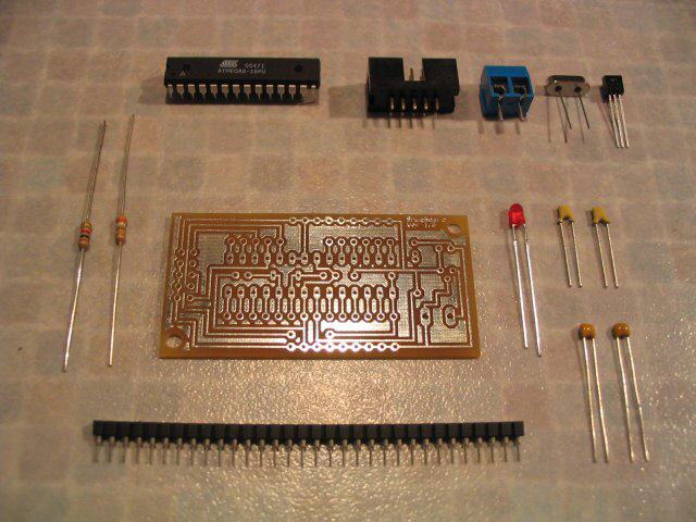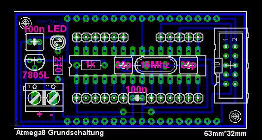 Es ist lediglich der Controller, ISP-Anschluss, Quarz, Spannungsregler eine Betriebs-Led, sowie 2 Widerstände und 4 Kondensatoren auf der Platine, die nur eine Grösse von 63*32mm aufweist. Eine feine Grundlage für kleine Projekte...