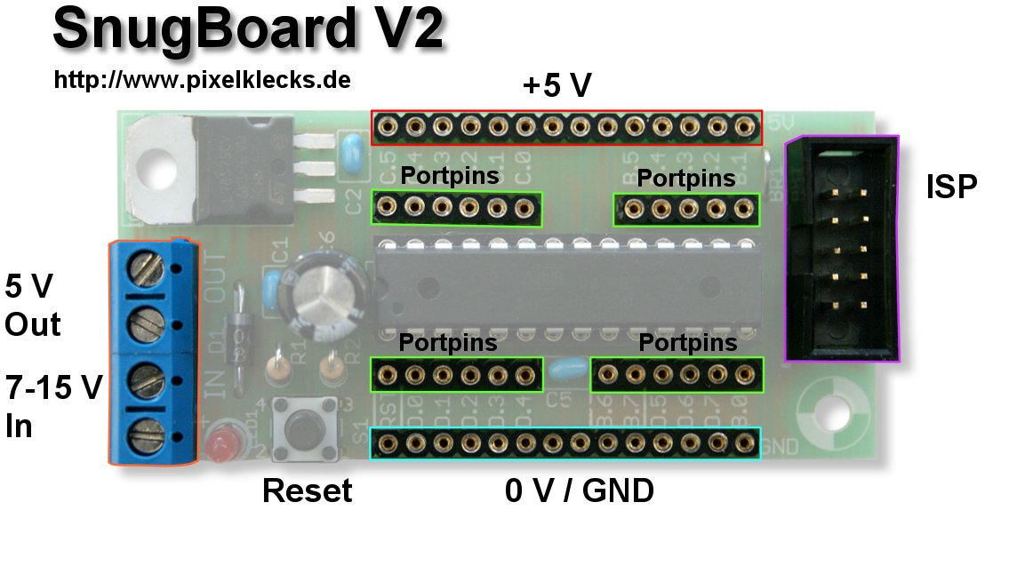 Das "SnugBoard V2" ist eine kleine Trägerplatine, die einen Microcontroller des Typ Atmega 8 (oder verwandte, pingleiche MicroController) aufnehmen kann, dort noch eine Spannungsregulierung, eine Takterzeugung für den Controller und einen ISP-Anschluß zur Verfügung stellt, sowie ALLE relevanten Pins des Chips auf steckbaren Pinleisten herausführt.