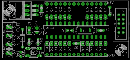 Nach Überprüfen der aufgebauten Platine sollte man noch OHNE Microcontroller eine Gleichspannung von 7-15 V auf die vorgesehene Schraubklemme gegeben werden (Q1=Plus, Q2=Minus). Zum Schutz der Schaltung ist eine Verpolungsschutzdiode eingebaut, die gegen eine falsch gerichtete Eingangsspannung schützt....daher kann auch bei einem Versehen nichts zerstört werden.