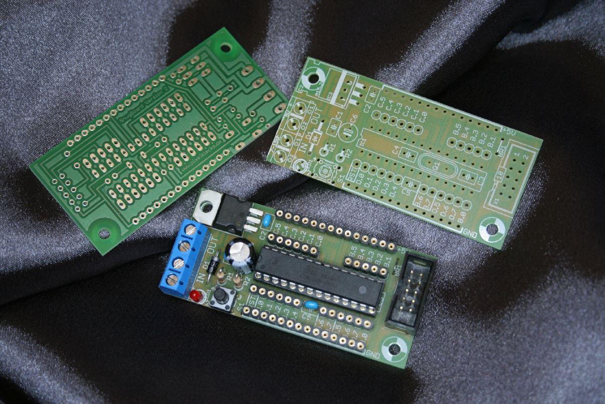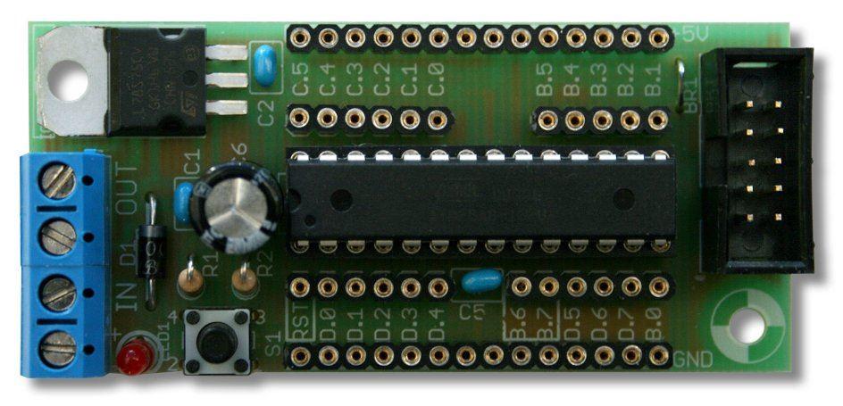 Das "SnugBoard V2" ist eine kleine Trägerplatine, die einen Microcontroller des Typ Atmega 8 (oder verwandte, pingleiche MicroController) aufnehmen kann, dort noch eine Spannungsregulierung, eine Takterzeugung für den Controller und einen ISP-Anschluß zur Verfügung stellt, sowie ALLE relevanten Pins des Chips auf steckbaren Pinleisten herausführt.