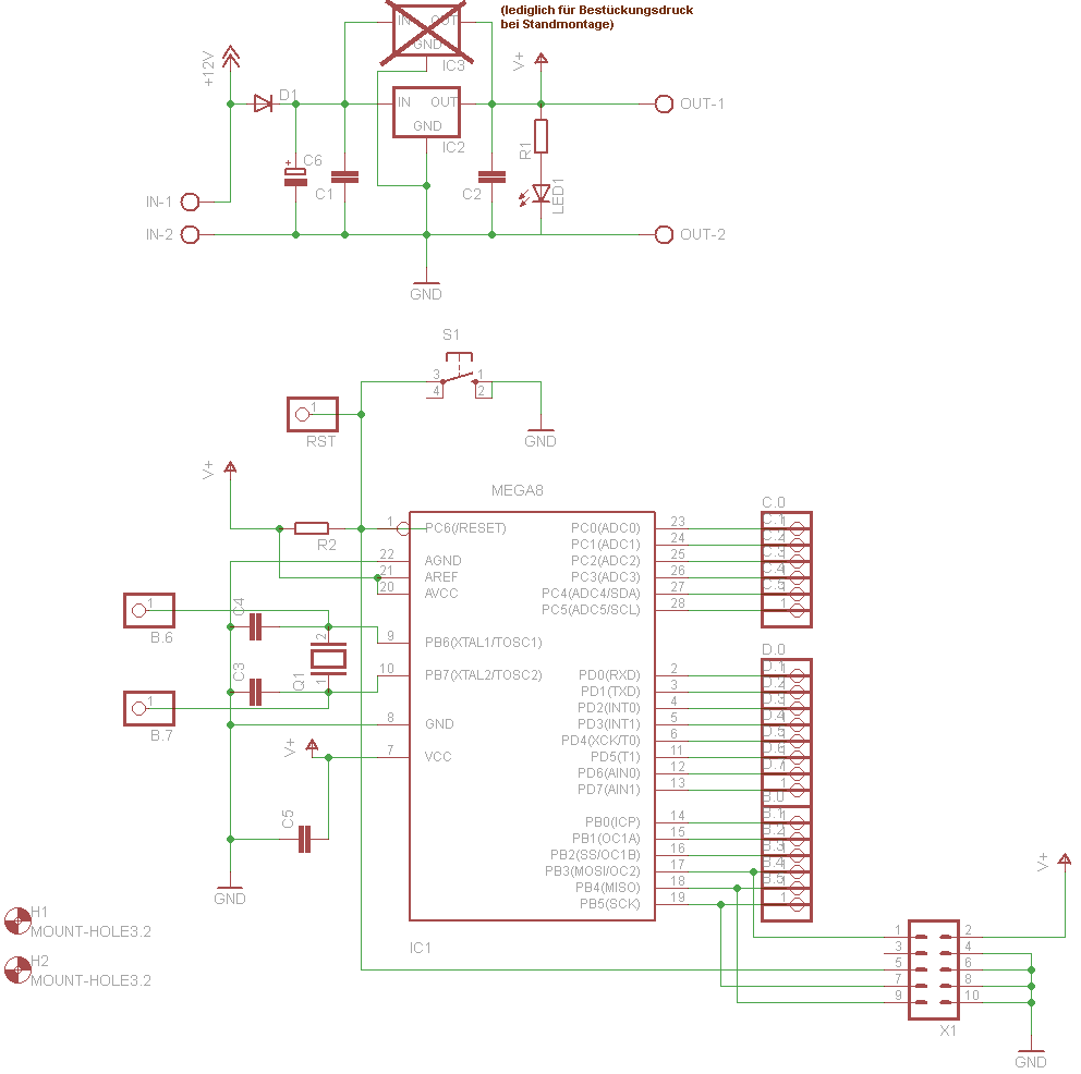 Nach Überprüfen der aufgebauten Platine sollte man noch OHNE Microcontroller eine Gleichspannung von 7-15 V auf die vorgesehene Schraubklemme gegeben werden (Q1=Plus, Q2=Minus). Zum Schutz der Schaltung ist eine Verpolungsschutzdiode eingebaut, die gegen eine falsch gerichtete Eingangsspannung schützt....daher kann auch bei einem Versehen nichts zerstört werden.