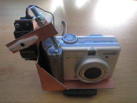 Für das Grundgerüst des Auslösers habe ich einfach ein paar Kupferplatinen zugeschnitten (mit einer kleinen Hebelblechschere), die Kanten verlötet und mit Bohrungen versehen. An den Arm des Servos habe ich eine Schloßschraube angebracht, die per Federkraft auf den Knopf der Kamera drückt - damit umgehe ich das Problem, dass evtl. der Knopf beschädigt wird, weil vielleicht zu fest/schnell gedrückt wird.