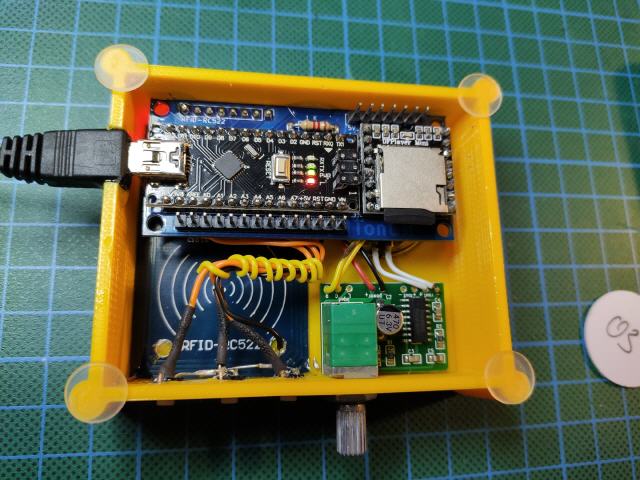Herzstück ist ein Arduino Nano & MP3-Modul (mit SD-Karte), dazu RFID Lesemodul und RFID-Tags und ein kleinen Verstärker & Lautsprecher, das Ganze in ein selbst konstruiertes und 3D gedrucktes Gehäuse gebaut - dann noch RFID-Tags unter kleine Figuren geklebt, relevante MP3-Samples auf der SD-Karte verknüpft, fertig ist mein Nachbau.