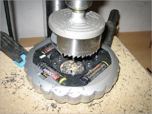 ...mit einer 68er Lochsäge die Mitte entkernt (Batterien können perfekt in den Haltern sitzen bleiben)