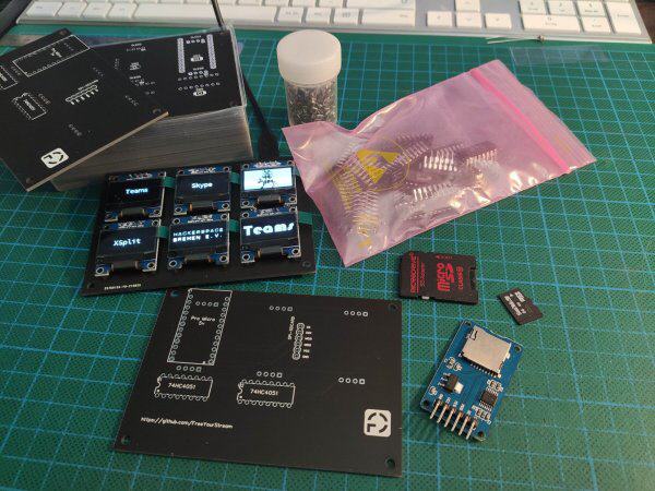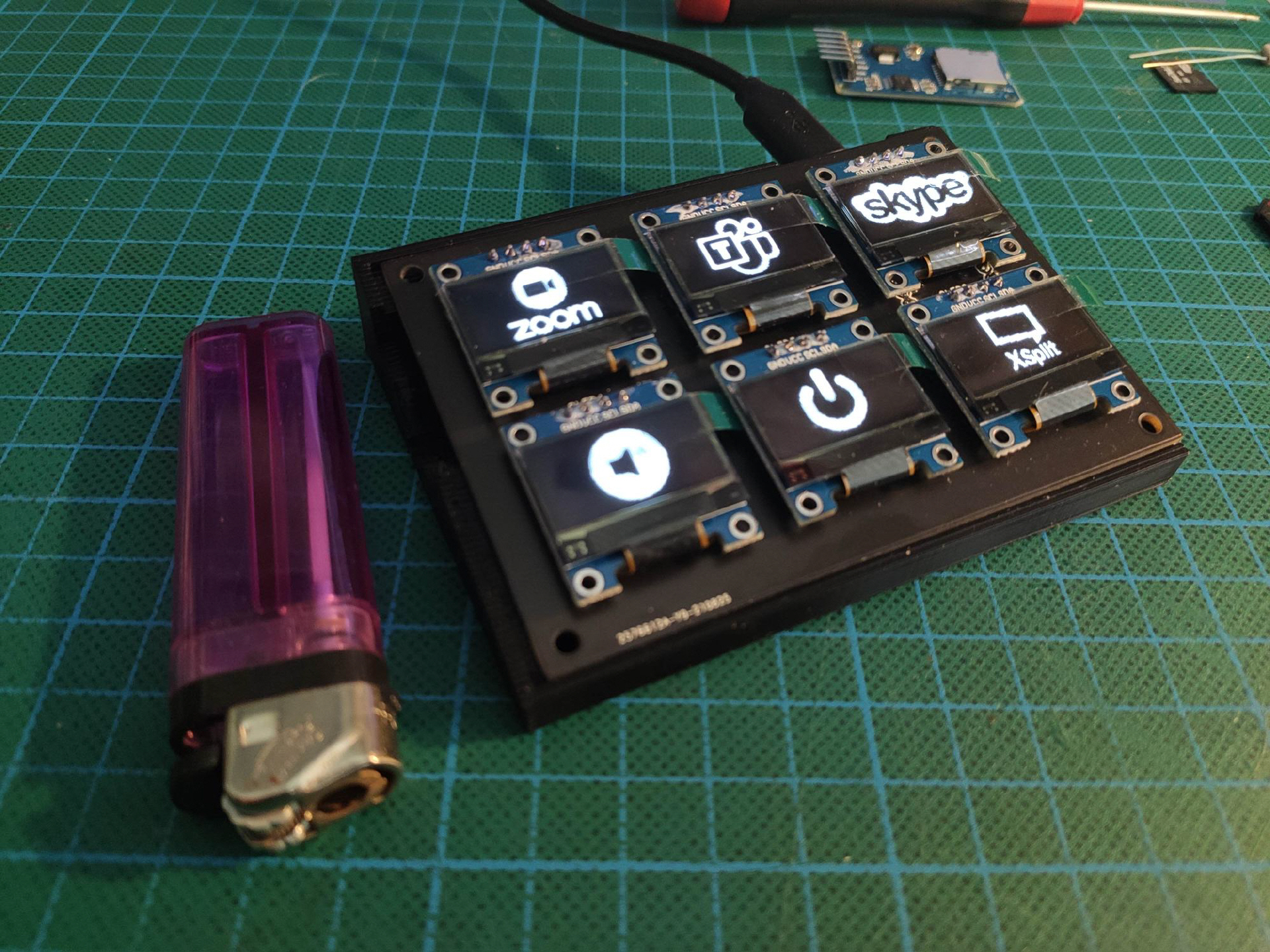 In diesem Projekt hingegen werden kleine OLEDisplays mit einem darunter liegenden Taster eingesetzt - zusammen mit zwei Multiplexer IC, die die i2c Datenleitung für 6 Displays umschalten und einem Arduino Pro Micro (Leonardo) der per USB als HID (Human Interface Device) als Tastatur an den PC angeschlossen wird. Es kann hinter jedem Display eine Tastaturfolge oder ein Sprung in ein Untermenü hinterlegt werden.