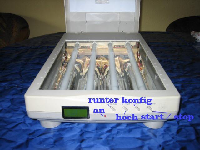 Zuerst wurde der Scanner von sämtlichen Innereien befreit, dabei fielen zwei (bestimmt noch für andere Projekte brauchbare) kleine Neonröhren und die Schrittmotorantriebsmechanik an, relavant ist aber nur das Gehäuse. Idealerweise hatte der Scanner 4 Bedientaster eingebaut, die ich zur Konfiguration/Steuerung des Belichtungsvorganges "missbrauche"