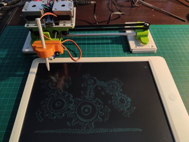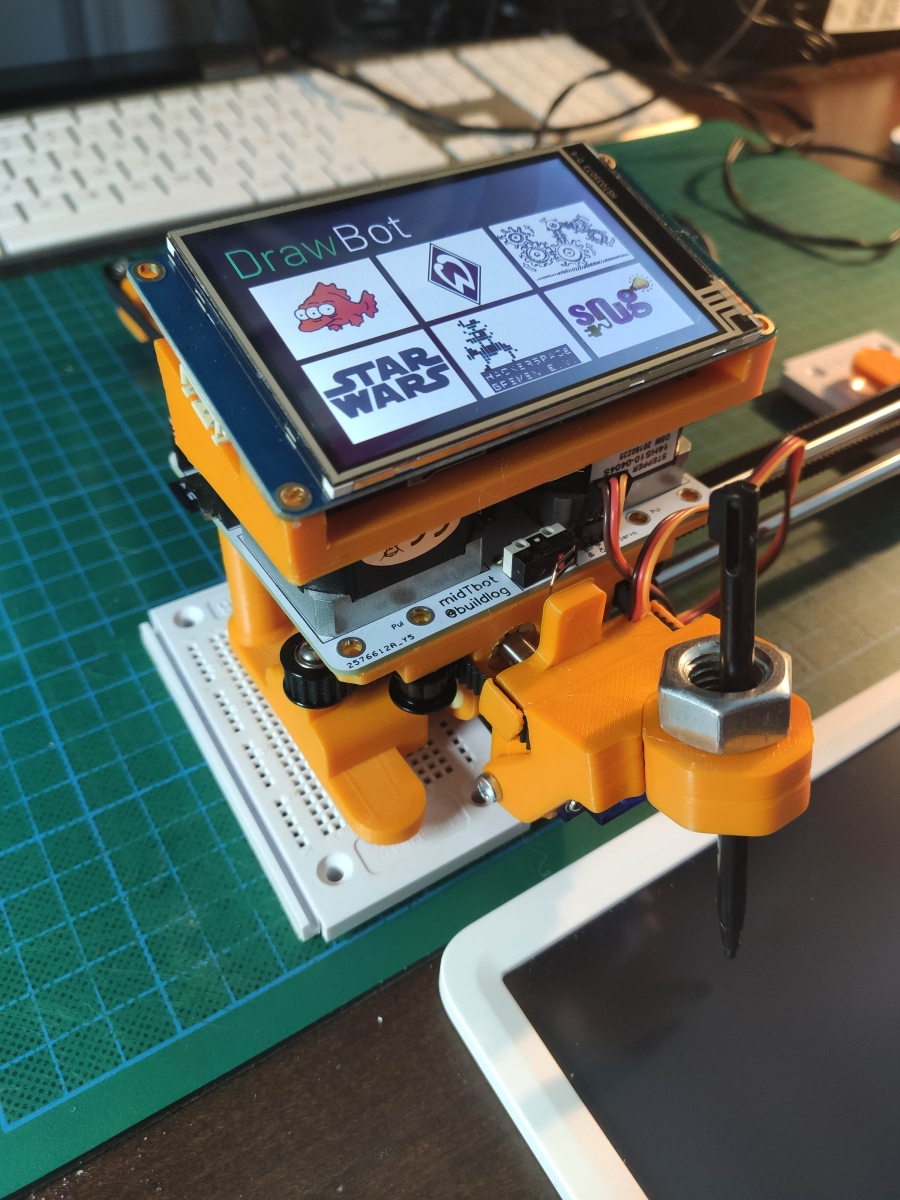 Coole Kombination - mein nachgebauter midTbot und eines von diesen günstigen LCD "Zeichenbrettern" (Xiaomi Mijia LCD Writing Tablet, ~12€), auf das man herummalen und Alles wieder auf Knopfdruck löschen kann.
