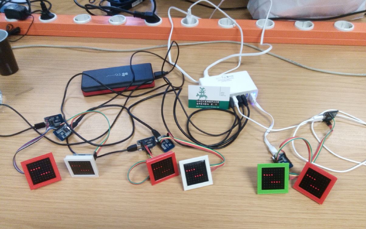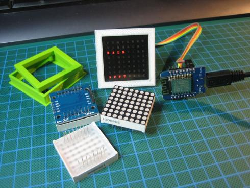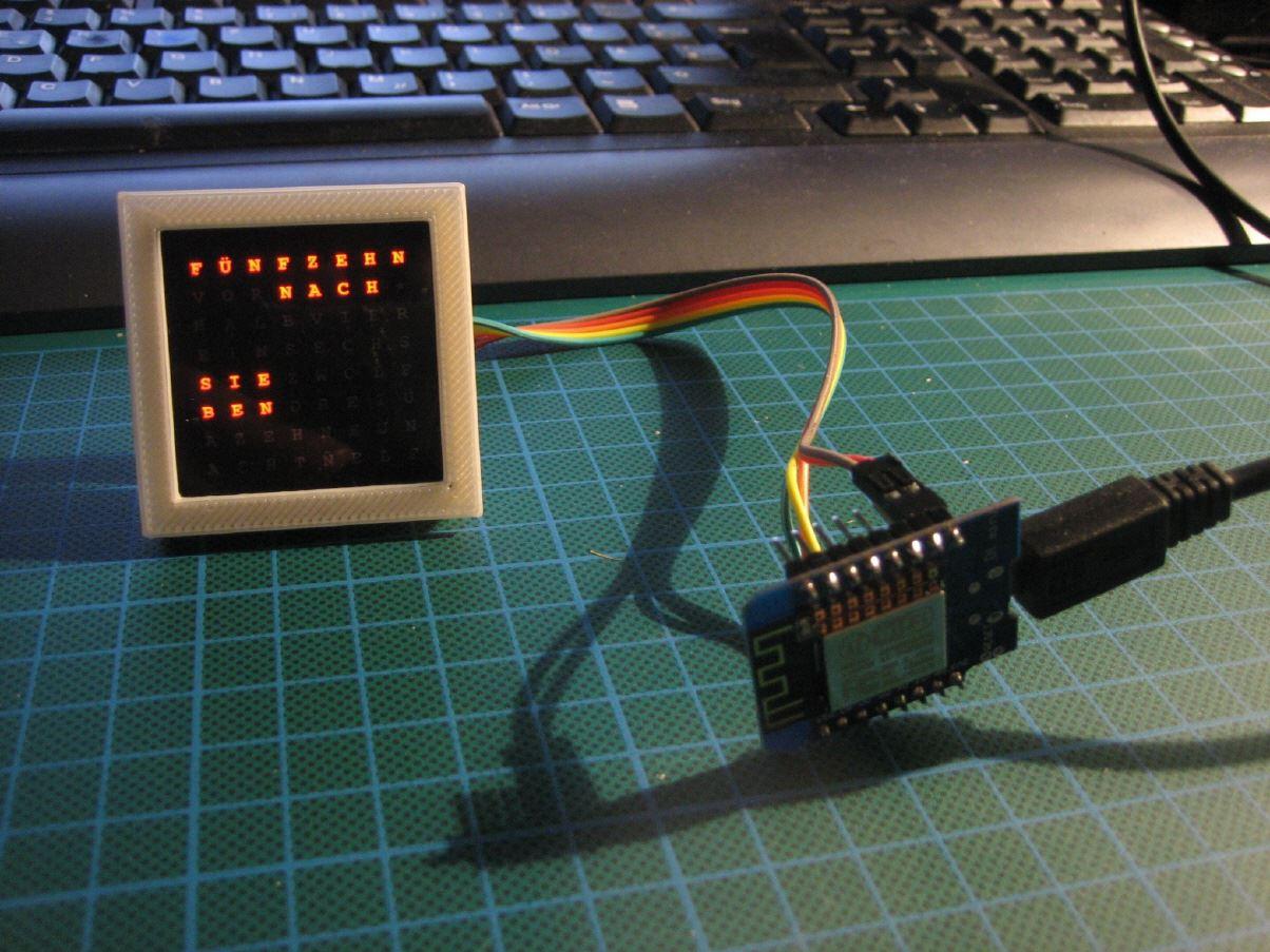 Der Clou dabei - es wird ein kleines 8x8 LED-Matrixmodul (Max7219) mit einem ESP8266 (NodeMCU Mini) angesteuert, über das sich die Uhr automatisch per WLAN/Internet/Zeitserver die aktuelle Zeit holt
