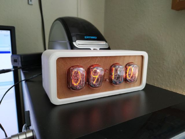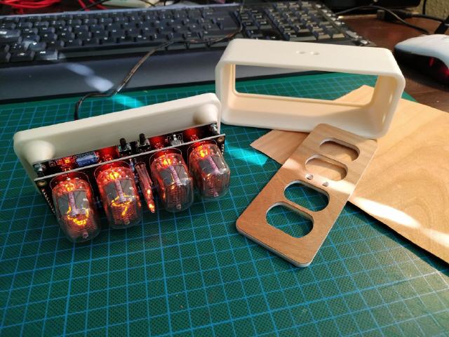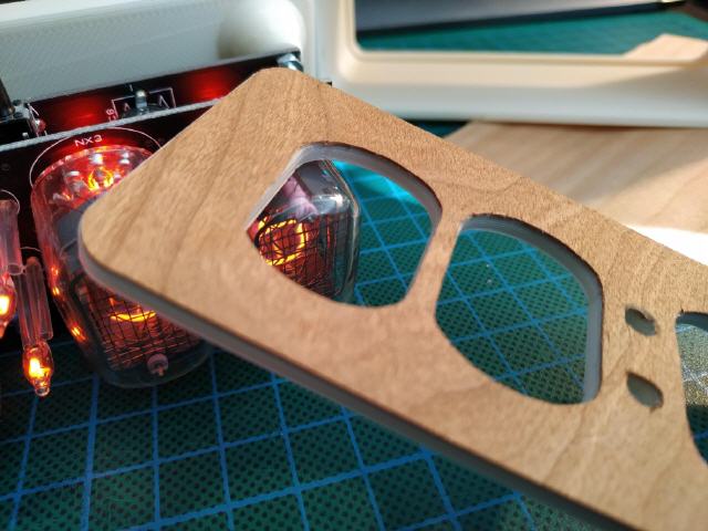 Ich habe mir im vergangenen Jahr einen preiswerten Bausatz für eine Nixieclock gekauft und zusammengebaut, die Tage habe ich zufällig bei Thingiverse ein tolles Gehäuse dafür gefunden. Die Frontplatte habe ich dann mit Furnierholz beklebt und die Auschnitte für die Röhren mit dem Skalpell herausgelöst.