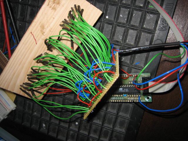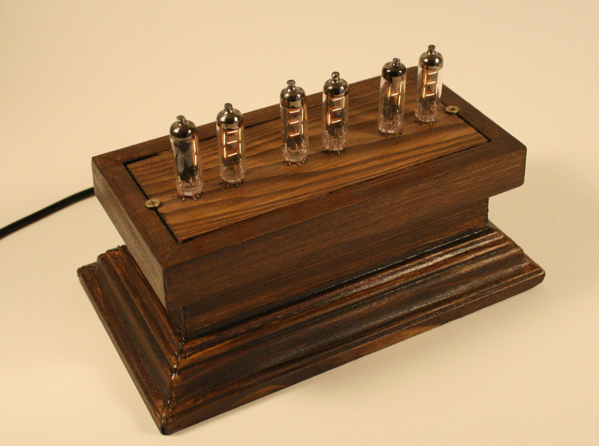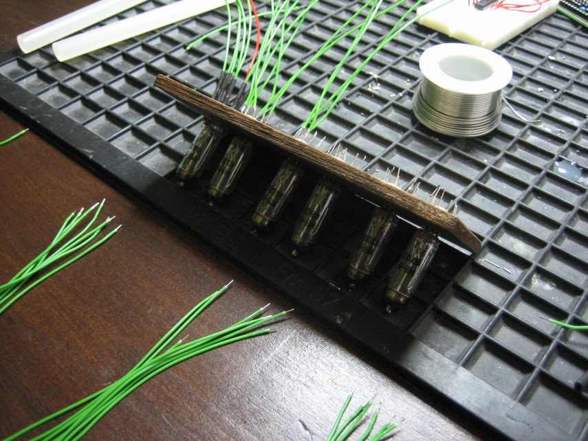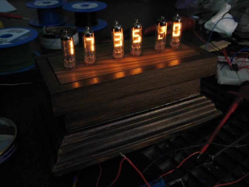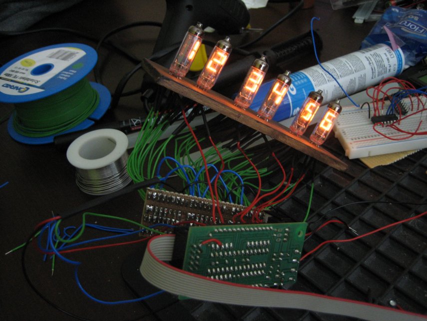 Bei Ebay ein paar Numitronanzeige (russische Glühfadenanzeige) geordert, jede Ziffer mit einem Schieberegister versehen (daher im Gegensatz zur einer Multiplexlösung absolut kein Flimmern), einen kleinen Atmega8 auf nem Snugboard und `nen Uhrenquarz dran...danach ein wirres Kabelgewirr als Paradebeispiel erzeugt, funktioniert aber trotzdem Alles... *g*