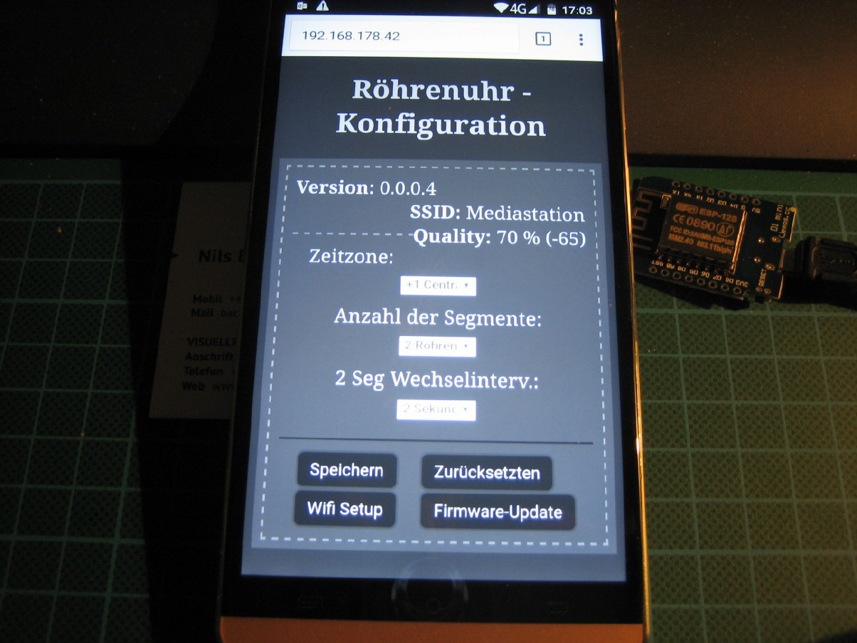 Ein Bekannter vom Verein hat mir für eine "nodemcu mini" (Microcontroller mit WLAN) auch eine tolle Firmware geschrieben, die nun automatisch über mein heimisches WLAN die Zeit in der Uhr über einen Zeitserver im Internet stellt. Das Ganze sehr komfortable über eine Konfigurationsseite per Smartphone bedienbar.