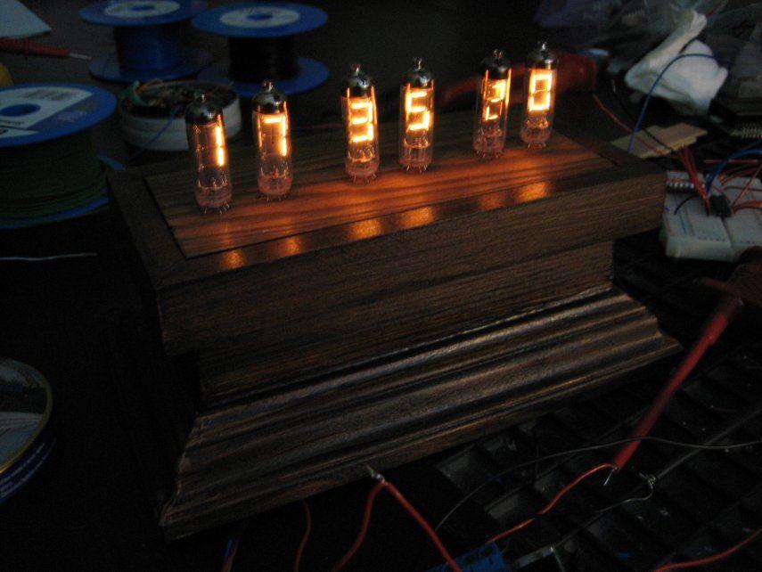Bei Ebay ein paar Numitronanzeige (russische Glühfadenanzeige) geordert, jede Ziffer mit einem Schieberegister versehen (daher im Gegensatz zur einer Multiplexlösung absolut kein Flimmern), einen kleinen Atmega8 auf nem Snugboard und `nen Uhrenquarz dran...danach ein wirres Kabelgewirr als Paradebeispiel erzeugt, funktioniert aber trotzdem Alles... *g*