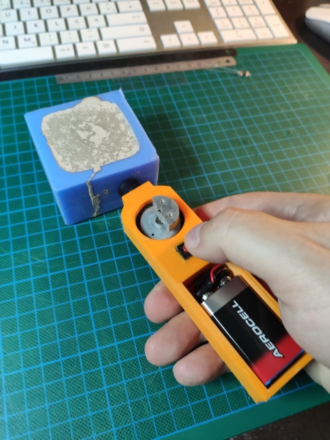 Um in angemischten Gießmassen die Lufblasen zu entfernen kann man entweder recht preisgünstige Vakuumpumpen/-Behälter nutzen, die die Blasen praktisch "herausziehen" (Top-Ergebnis) oder man kann sie mechanisch herausrütteln (einfach & günstig), für letzteres habe ich mir einen kleinen Rütteladapter gebaut.